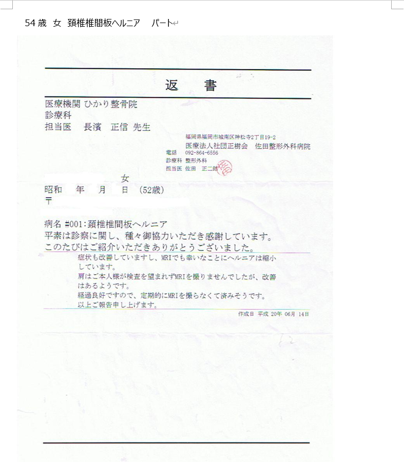 54歳 女 頚椎椎間板ヘルニア パート