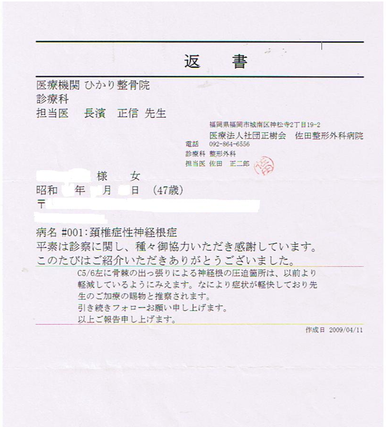 47歳 女 頚椎症性神経根症 パート
